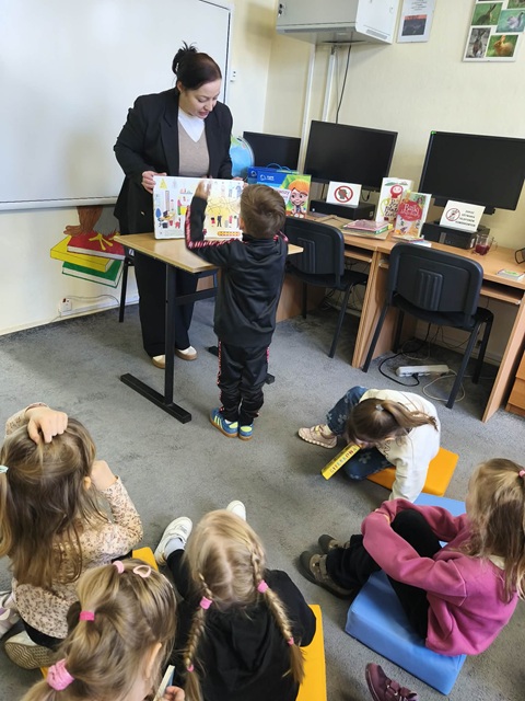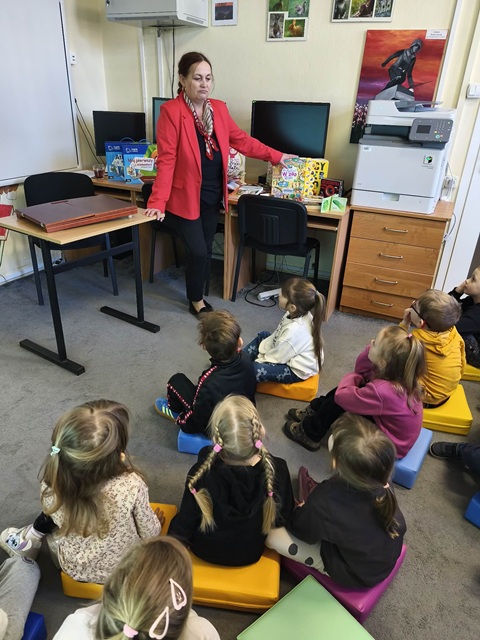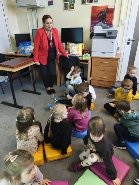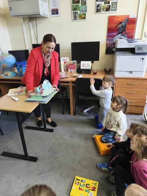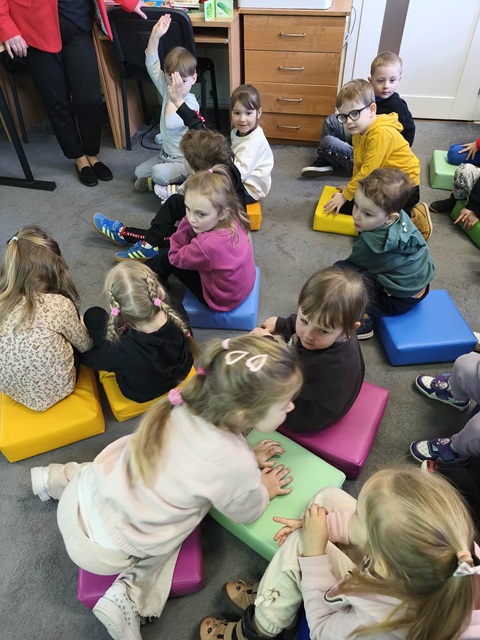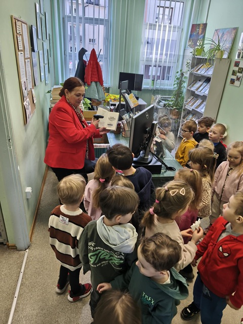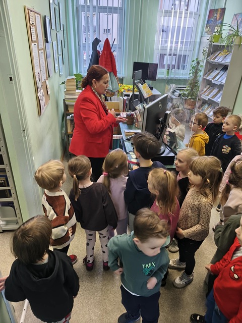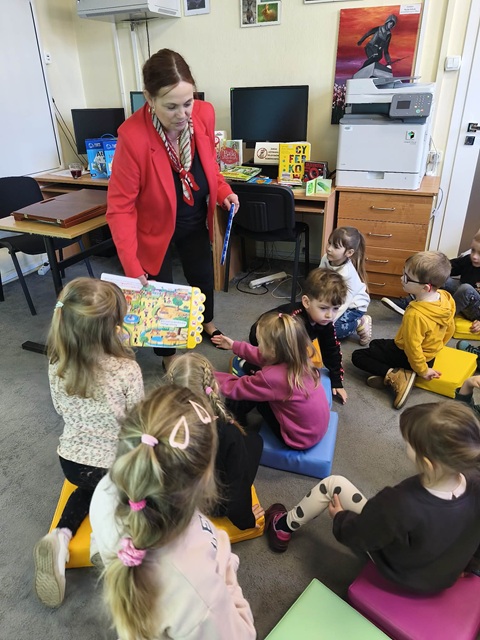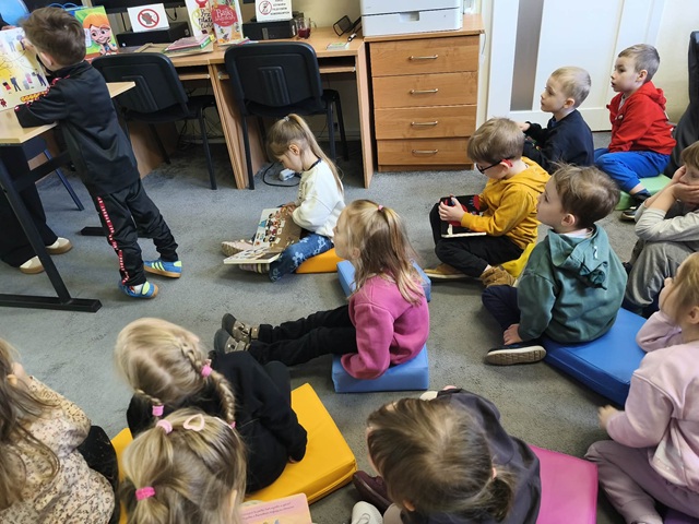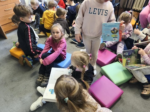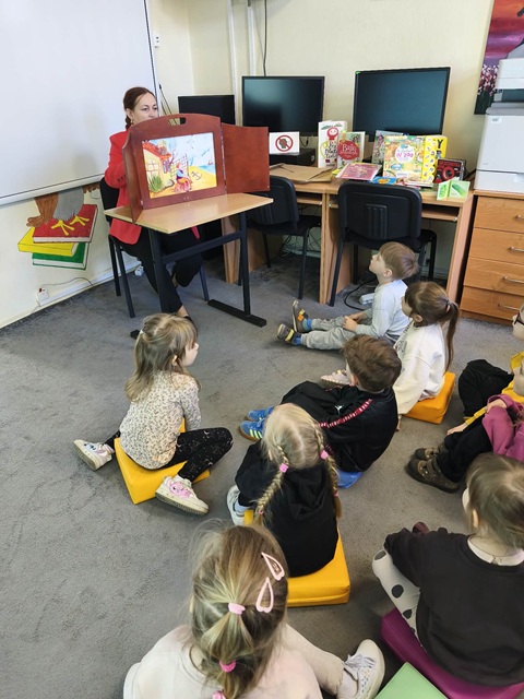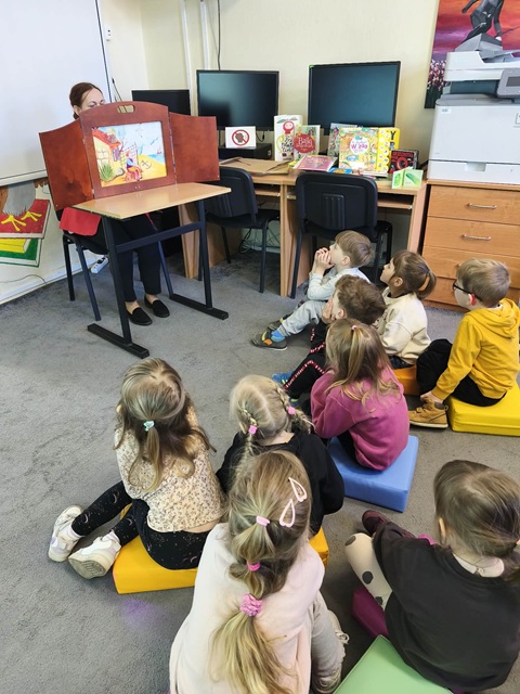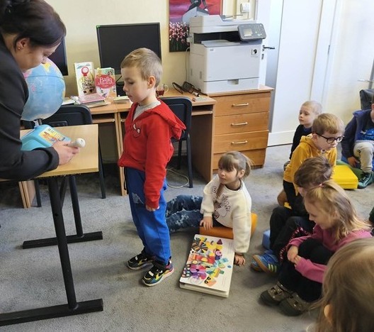 10 kwietnia 2026 A. Mierzwa – kierownik mławskiej filii Biblioteki Pedagogicznej i A. Wesołowska nauczyciel bibliotekarz poprowadziły zajęcia edukacyjne dla przedszkolaków z Przedszkola Dzieciątka Jezus w Mławie. 4 latki odwiedziły naszą bibliotekę w związku z przypadającym 2 kwietnia Międzynarodowym Dniem Książki dla Dzieci. Świętem celebrowanym w dniu urodzin duńskiego baśniopisarza Hansa Christiana Andersena. Na naszych przemiłych gości czekało mnóstwo atrakcji. Zaczęliśmy od wypożyczalni. Tam dzieci dowiedziały się czym jest to pomieszczenie i do czego służy. Obejrzały też wiosenną wystawę prac plastycznych autorstwa wychowanków Specjalnego Ośrodka Szkolno-Wychowawczego w Mławie, która jest w wypożyczalni właśnie wyeksponowana. Następnie wspólnie podziwialiśmy tradycyjne książki w różnorakiej formie: dźwiękowe, rozkładanki, puzzle, harmonijki czy grzechotki, ale też zdobycze nowoczesnych technologii jak seria książek z magicznym piórem Albik. Niesamowitą atrakcją okazała się książka „Muminki szukają domu” w wersji pop-up. Jest to historia o tym jak Muminek i jego Mamusia szukają domu, który porwała powódź. Każda kolejna strona tej przestrzennej opowieści prezentuje bajeczne zakątki i trójwymiarowe sceny, które zachwycają odbiorców. Na dzieci czekało również przedstawienie w teatrzyku kamishibai. Dziś na naszym teatralnym afiszu znalazła się bajka „O rybaku i złotej rybce”. Spotkanie zakończyliśmy wspólnym wyszukiwaniem ciekawostek na temat wybranych przez dzieci zakątków świata na interaktywnym globusie.