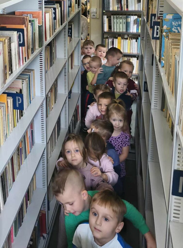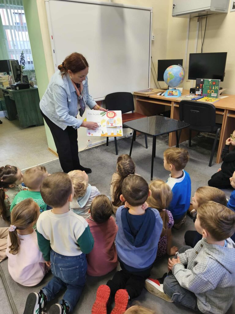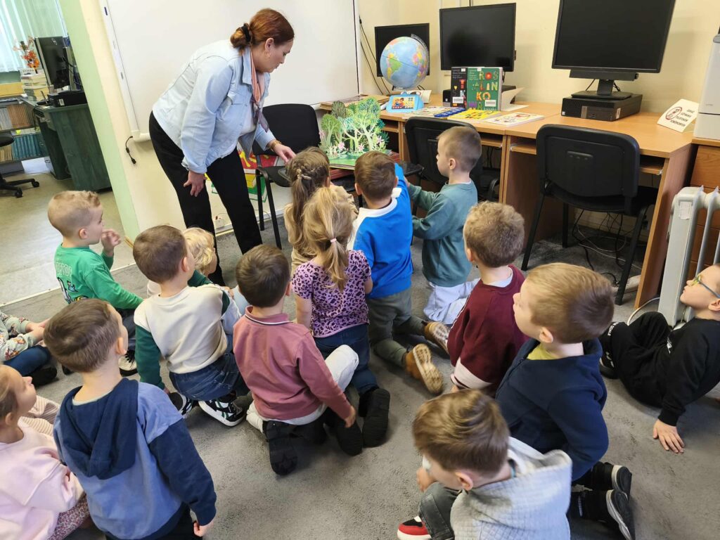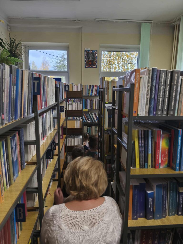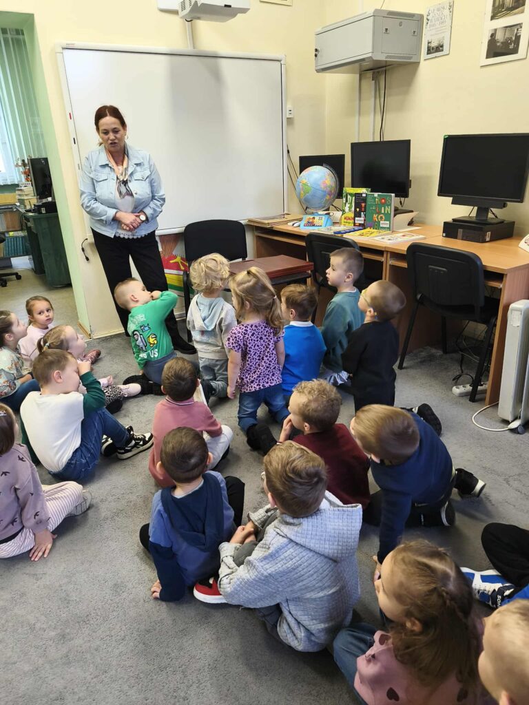 Agata Mierzwa i Anna Wesołowska w środowe przedpołudnie 29 października 2025 roku poprowadziły zajęcia edukacyjne z cyklu „Interaktywna biblioteka w praktyce” dla grupy „Księżyce” z MPS nr 4 w Mławie. Spotkanie było bardzo intensywne i obfitowało w liczne atrakcje. Było przy tym mnóstwo śmiechu i dobrej zabawy. Na początek nasi przemili goście poznali różne rodzaje książek, przy czym musimy zaznaczyć, że podobały się im absolutnie wszystkie bez wyjątku! Każdy chętny mógł też sprawdzić możliwości globusa interaktywnego. A wszyscy razem wysłuchaliśmy z zapartym tchem prezentowanej przez A. Mierzwę w teatrzyku kamishibai opowieści o „Rybaku i złotej rybce”. Potem A. Wesołowska bawiła się z dziećmi na magicznym dywanie, a zwieńczeniem spotkania było zwiedzanie pomieszczeń biblioteki, po których przesuwaliśmy się „pociągiem” dbając o to, by nie zgubić żadnego z cennych wagoników. Było nam bardzo miło Was gościć!